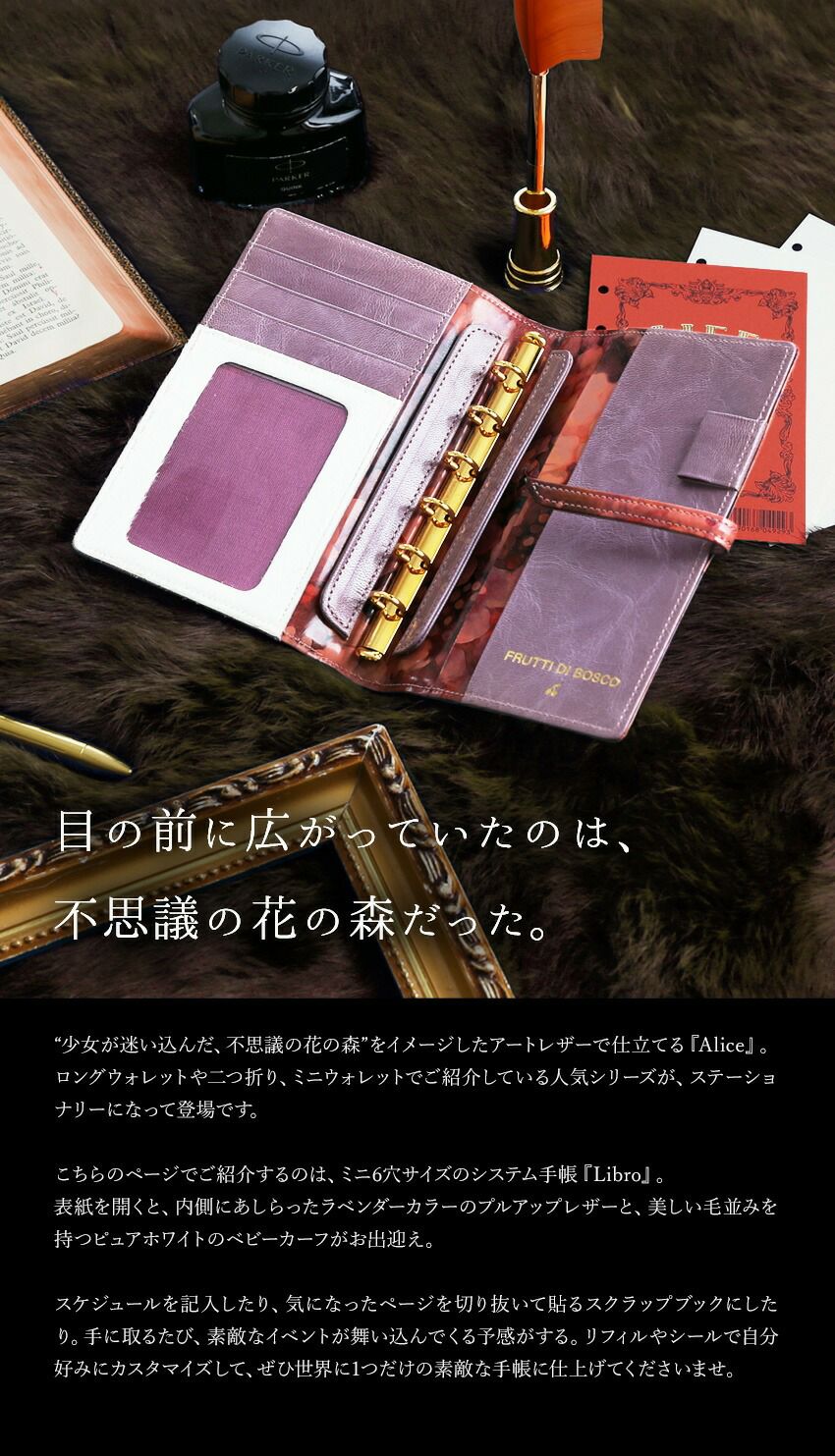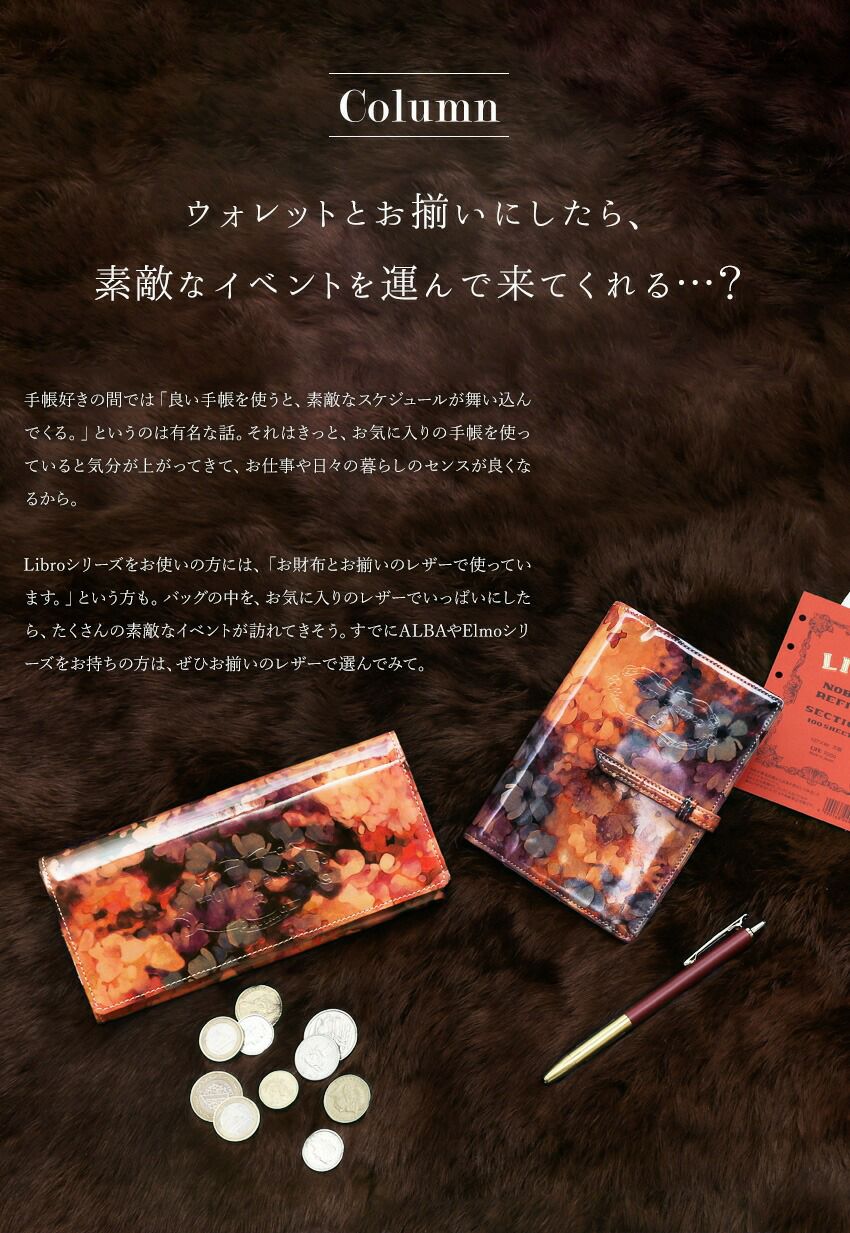 良い手帳を持つ人には、 手帳好きの間では「良い手帳を使うと、素敵なスケジュールが舞い込んでくる。」というのは有名な話。それはきっと、お気に入りの手帳を使っていると気分が上がってきて、お仕事や日々の暮らしのセンスが良くなるから。 まるで絵画のように美しいアートレザーで仕立てたシステム手帳たちは、使ったその日から嬉しいイベントが訪れそうな気分にさせてくれます。眺めているだけで感性を刺激され、素敵なアイデアが浮かんでくるので、アイデアノートやスクラップブックとして使っていただいても、もちろんOK。 |